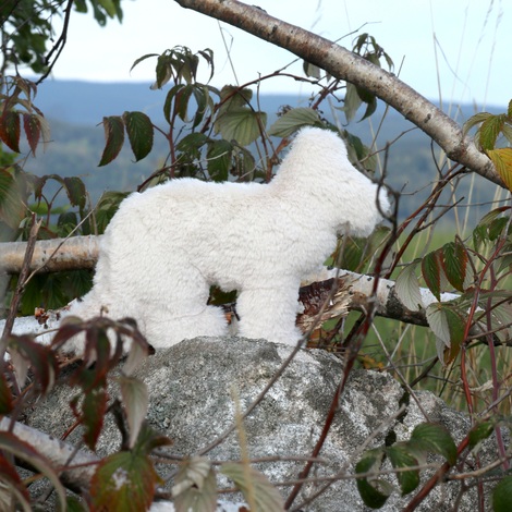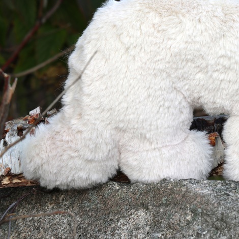 Potištěná látka z autorským tiskem je složena z 80% bavlny a z 20% polyesteru. Zádíčka chlupáče jsou z béžového plyše a vyplněn je dutým vláknem ve formě polyesterových kuliček.