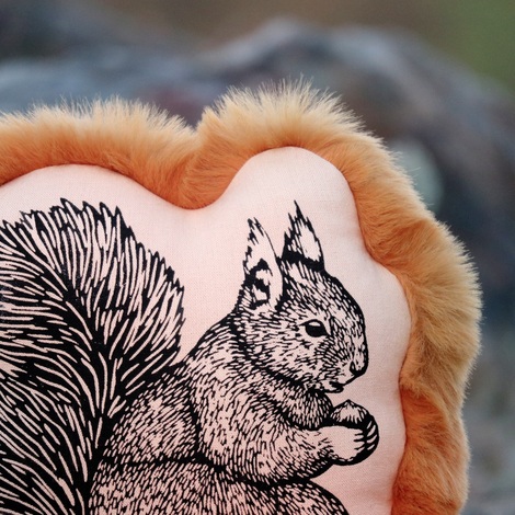 Jeho přední strana je zdobená autorským linorytem, ručně natištěným sítotiskem, což každému kousku dodává jedinečný a umělecký vzhled, zatímco zadní strana je pokryta hebkým plyšem, který připomíná jemnou srst veverky. Pečlivý design a kvalitní materiály činí z veverky nejen roztomilého společníka, ale také stylový a originální doplněk do každého interiéru.